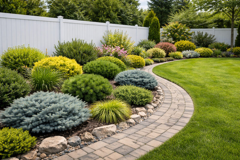 Pravilno raspoređeni niski četinari stvaraju jasnu ivicu, popunjavaju prazne površine i stabilizuju izgled dvorišta tokom cele godine.
